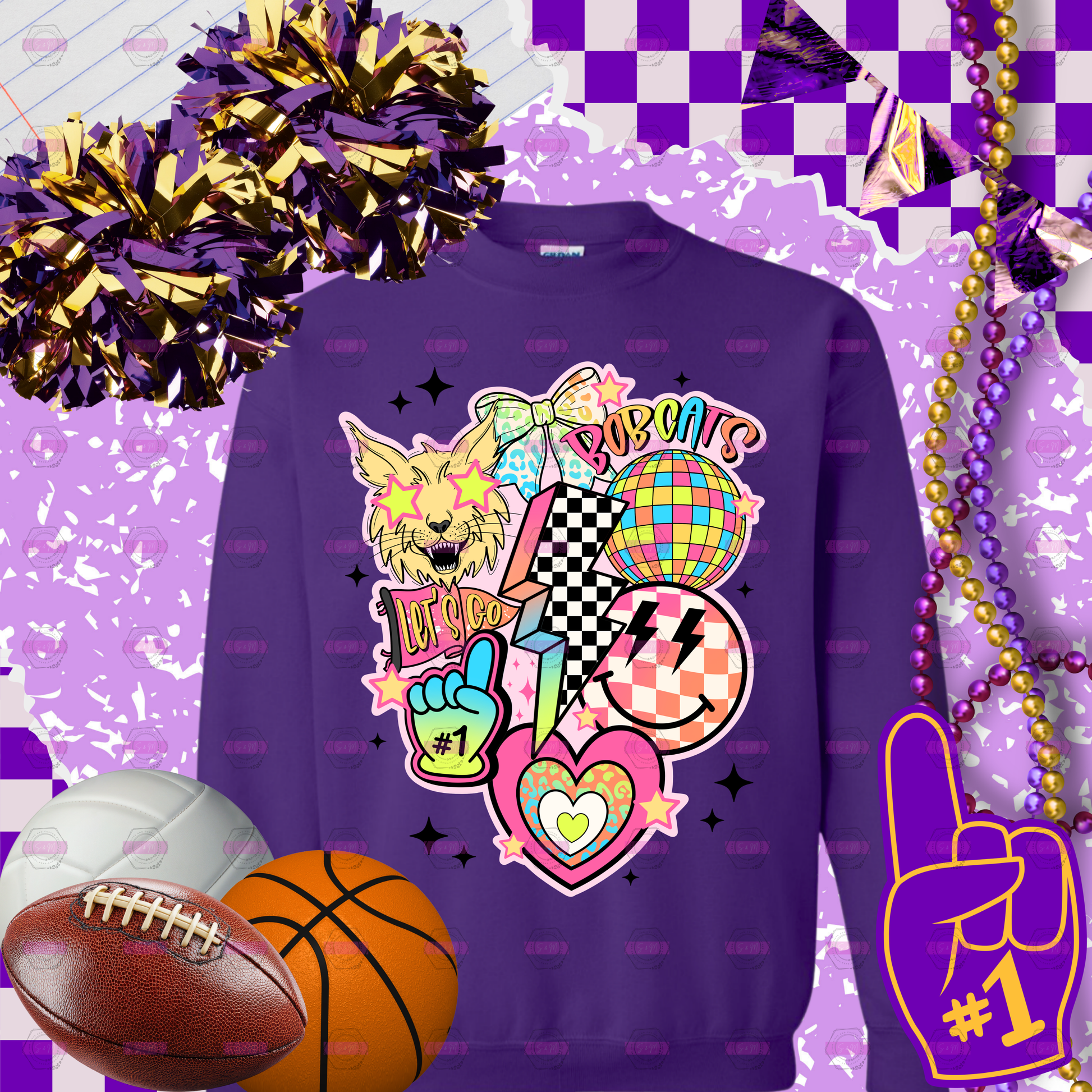 Bring the spirit and the fun with our Bobcats Retro Spirit Sweatshirt. This bold and playful design features a trendy mix of checkerboard, disco, smiley, stars, and sporty school spirit elements for the perfect standout look on game day, pep rallies, school events, or everyday casual wear.